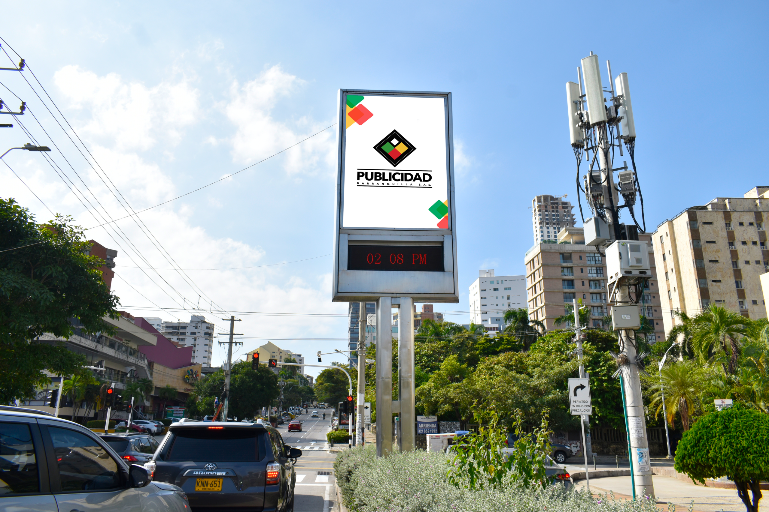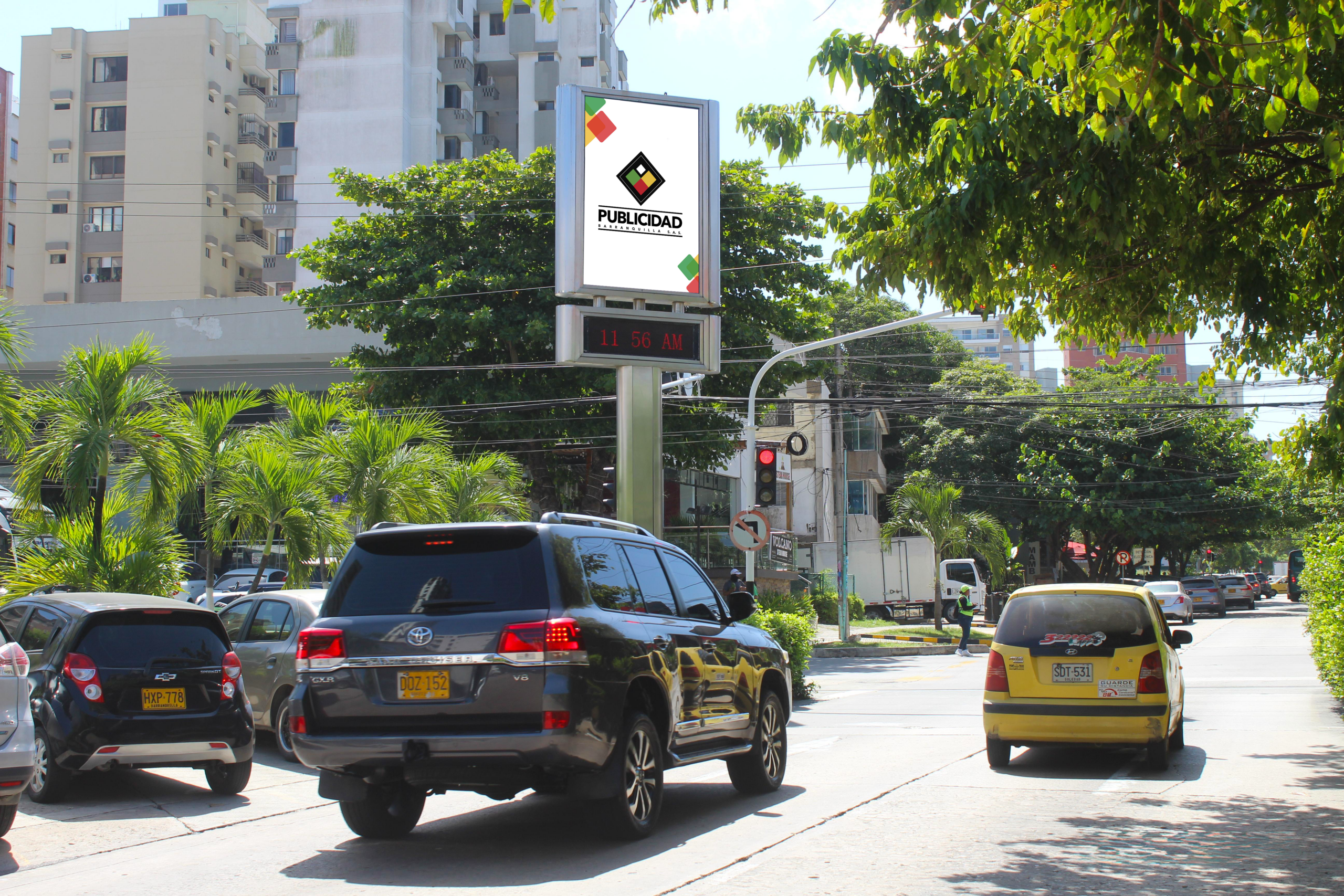 El Reloj es un elemento publicitario de alto impacto por su diseño y ubicación posee una estructura en acero inoxidable con dos caras Iluminadas las cual embellecen la pauta causando una visión más clara de lo que se quiere transmitir, informa al peatón y al conductor la hora y temperatura actual de Barranquilla. Ubicados en los mejores sitios de la ciudad.